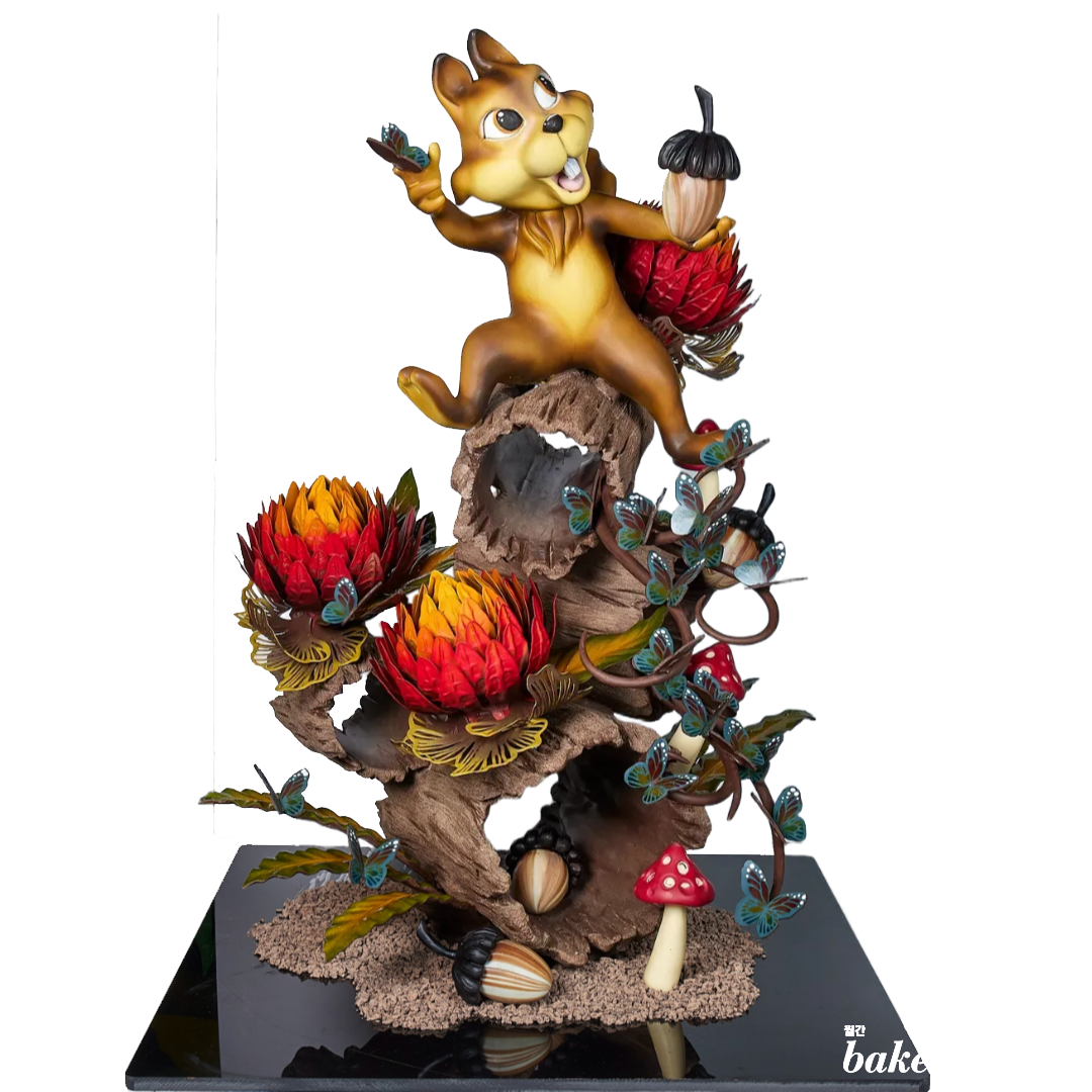 장난기 가득한 얼굴의 귀여운 다람쥐가 호기심 어린 눈으로 세상을 바라보는 모습을 표현했습니다. 세상의 모든 것이 신기하고 색다르게 느껴지는 다람쥐의 눈에는 단색의 도토리도 줄무늬의 도토리로 보이고, 꽃을 비롯한 숲속의 모든 것들이 더 알록달록하게 보입니다. 자신 역시 자연의 일부이면서, 자연을 호기심 있게 기대하며 보고 있는 다람쥐의 시선은 먼 곳을 응시하는 듯 만들었습니다. 어쩌면 작품 속 다람쥐의 마음은, 무한한 제과 제빵 세계를 보고 있는 저의 마음이기도 할 것입니다.