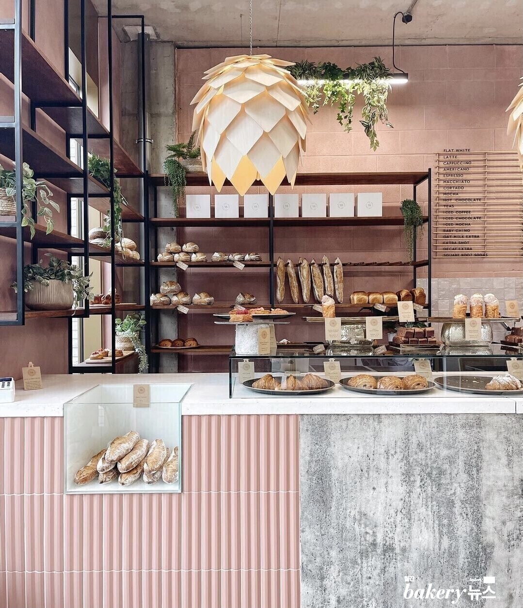 이스트 베이커리는 레스토랑과 제과 공간의 경계를 자연스럽게 넘나드는 현대적인 매장 구성으로도 잘 알려져 있다. 디자인 스튜디오 '런 폴 더 힐즈(Run For The Hills)'와 함께 인테리어한 공간으로, 반벽과 가구를 활용해 넓은 매장 공간을 유기적으로 분리해 고객에게 시각적 몰입감과 여유로운 동선을 제공한다. 분홍색 인디 핑크와 빈티지 소품들이 어우러져, 마치 웨스 앤더슨 감독의 영화 <그랜드 부다페스트 호텔>을 연상시킨다. 독특하게 안쪽으로 바 테이블이 있는데 마주보는 통창으로 베이킹 공간을 한눈에 바라볼 수 있어, 식사를 하거나 커피를 즐기며 분주한 제빵사들을 지켜보는 것도 재미 요소다. 평일에는 종일 크게 붐비지 않아, 업무나 스터디 할 공간을 찾는다면 제격이다. 평일에는 노트북이 허용되지만, 주말에는 불가하다고 하니 참고하자